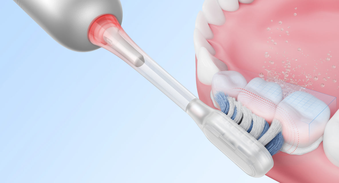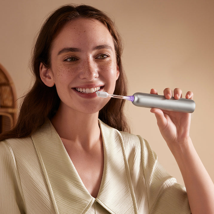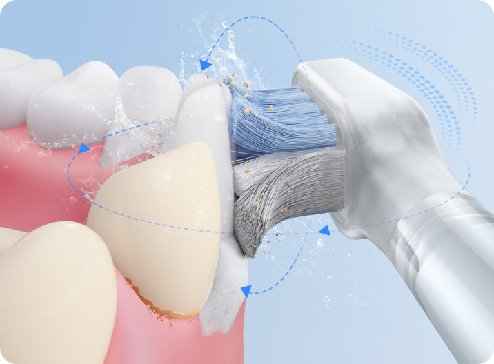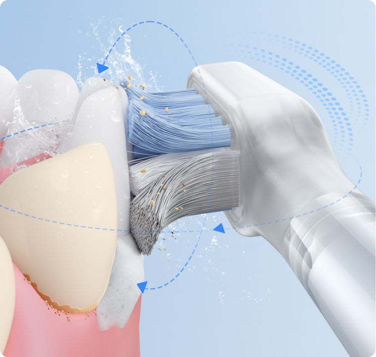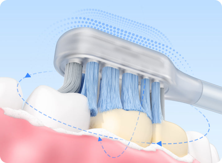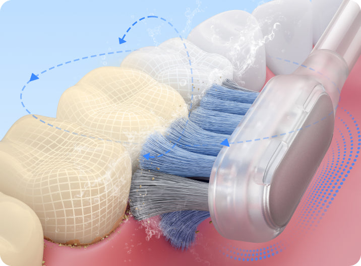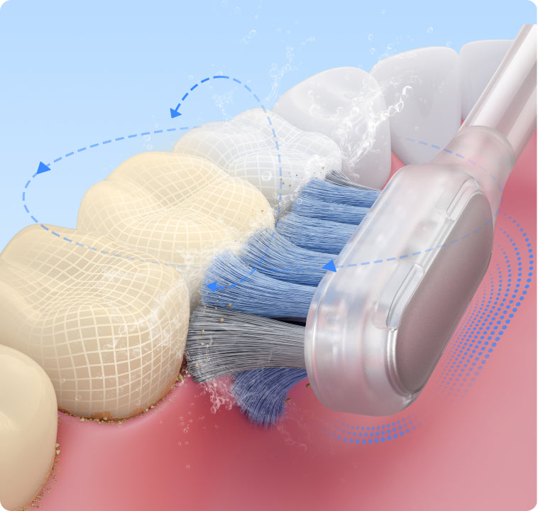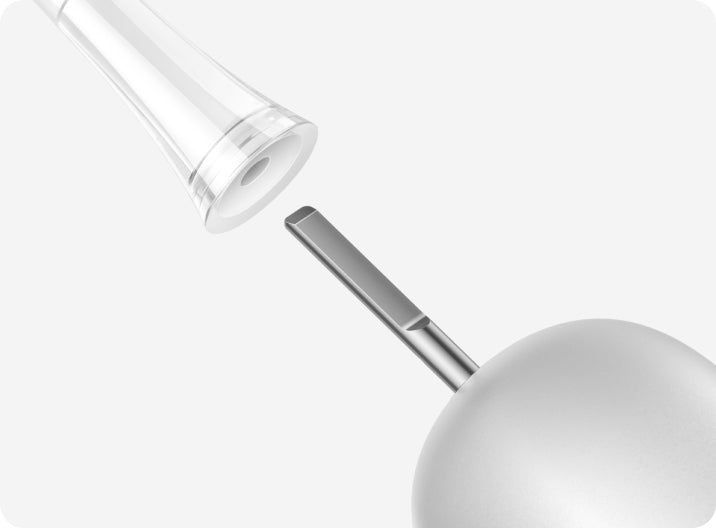 FDA 承認*済みの敏感なブラシヘッドが、歯茎を傷つけることなく、歯茎のラインに沿って優しく磨きます。非常に柔らかい 0.01mm* の毛先が、敏感な歯ぐきを安全かつ効率的にケアし、歯と歯ぐきの間の狭い隙間から歯垢をスムーズに除去します。