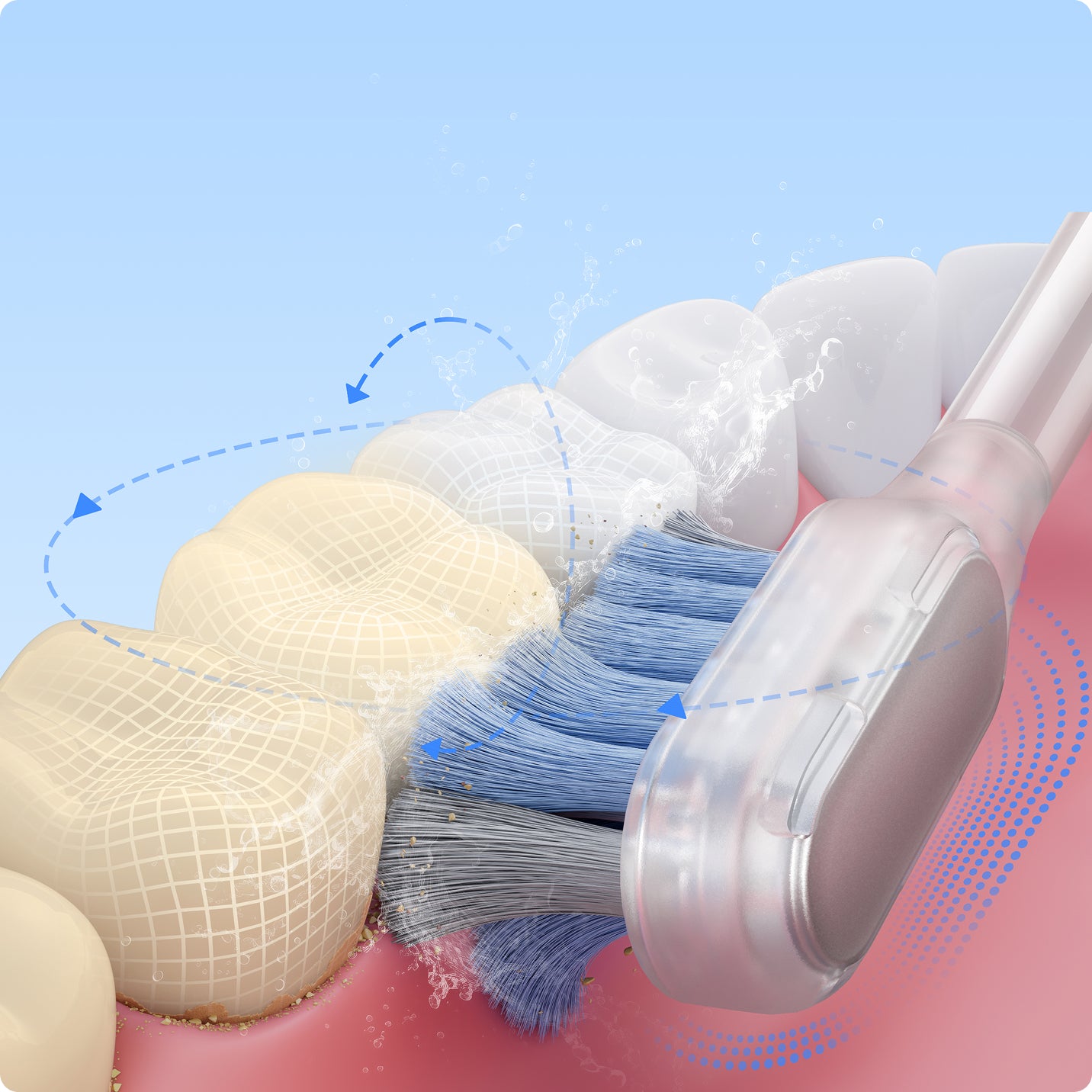 ダイヤモンド型のブラシが、表面の汚れをより徹底的に落とします。丸いブラシよりも 2 倍*多く表面の汚れを落とします。