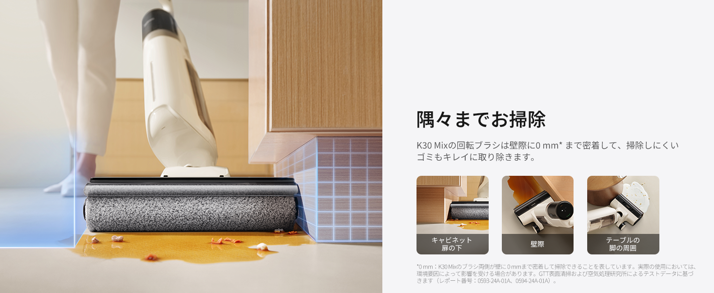 *0 mm:床掃除機がブラシの左右両側で壁との距離 0 mm を保った状態で除塵できることを表しています。実際の使用においては、環境要因の影響を受ける場合があります。GTT サーフェスクリーニング&エアトリートメント研究所のテストデータに基づきます(レポート番号:0593-24A-01A、0594-24A-01A)。