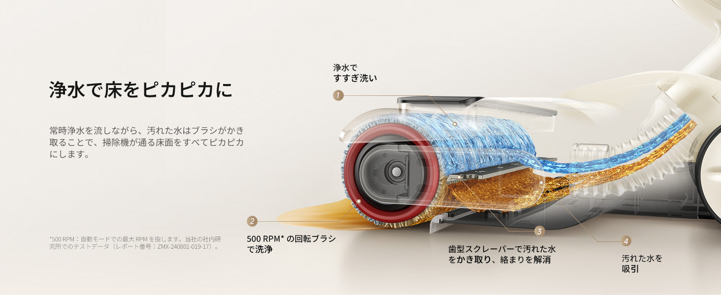 *0.2 g 未満:床掃除機が前方に移動した後で床面に残る水の跡。当社の社内研究所のテスト結果に基づきます(レポート番号:ZMX-240801-018-33、ZMX-240801-018-34、ZMX-240801-020-27、ZMX-240801-020-28)。