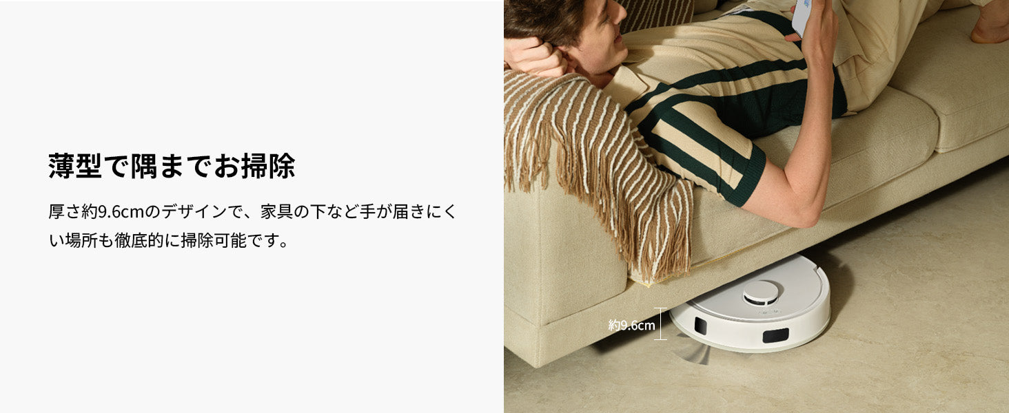 一般的な床掃除機の直径は35cmだが、MOVA E20は32cm,コンパクトな本体で家具やペット、人をするりと避けて家中を確実に走り回り、ゴミを一掃します。
