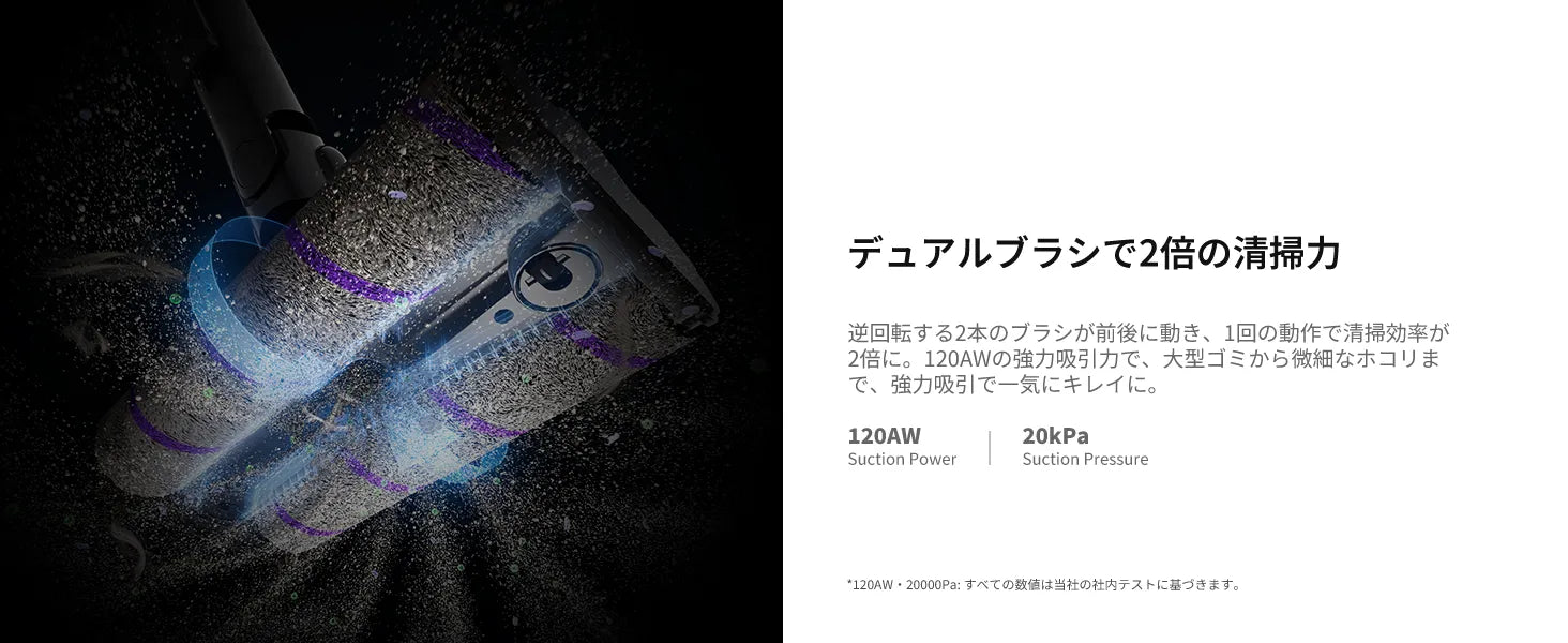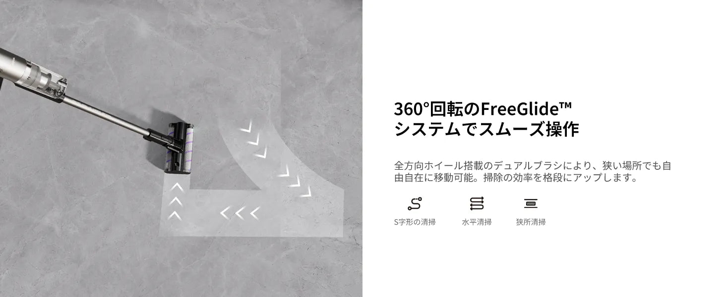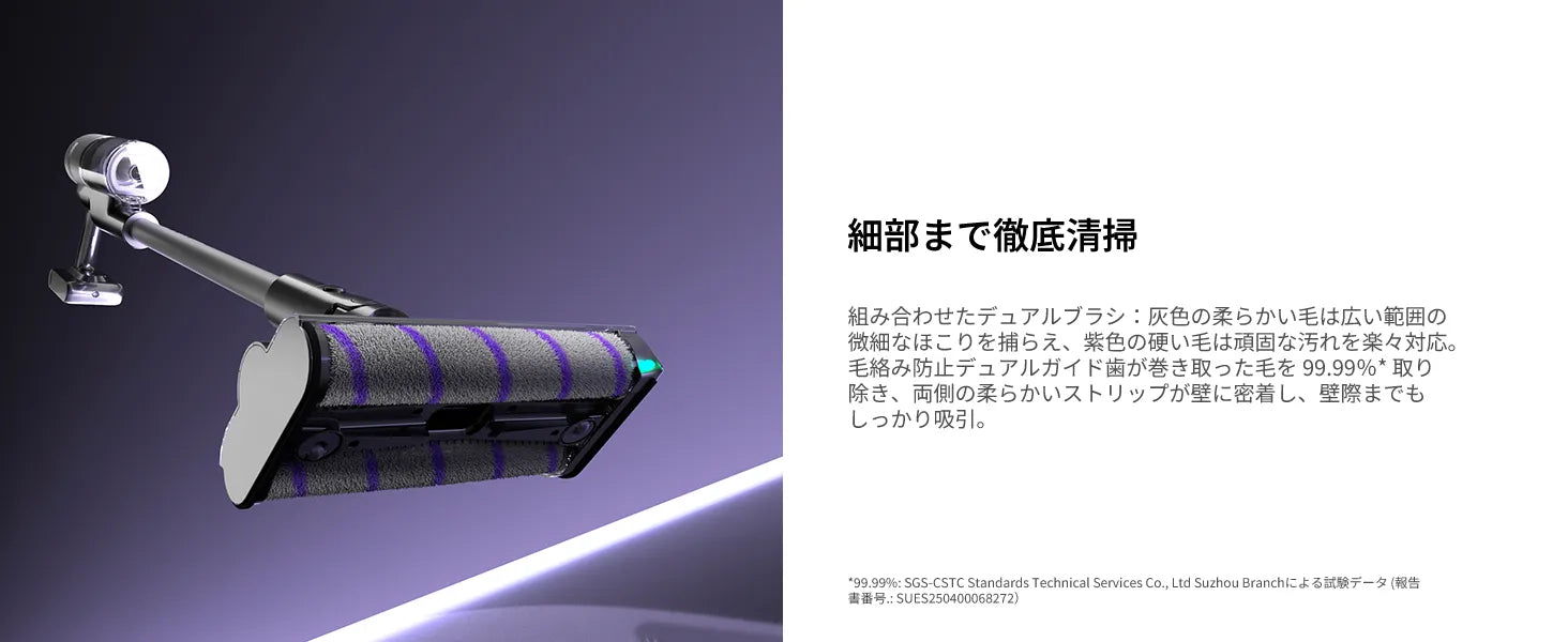 独自の全方向デュアルローラーブラシが髪の毛の絡まりを防ぎ、フローリングまでスムーズに対応