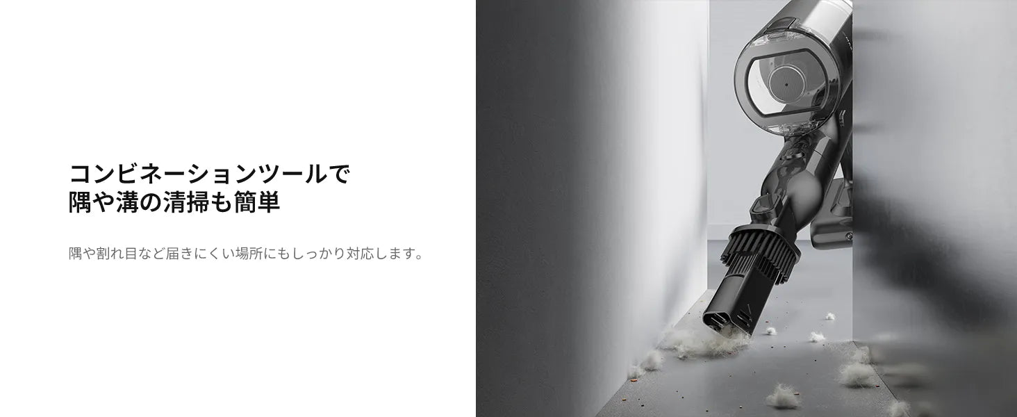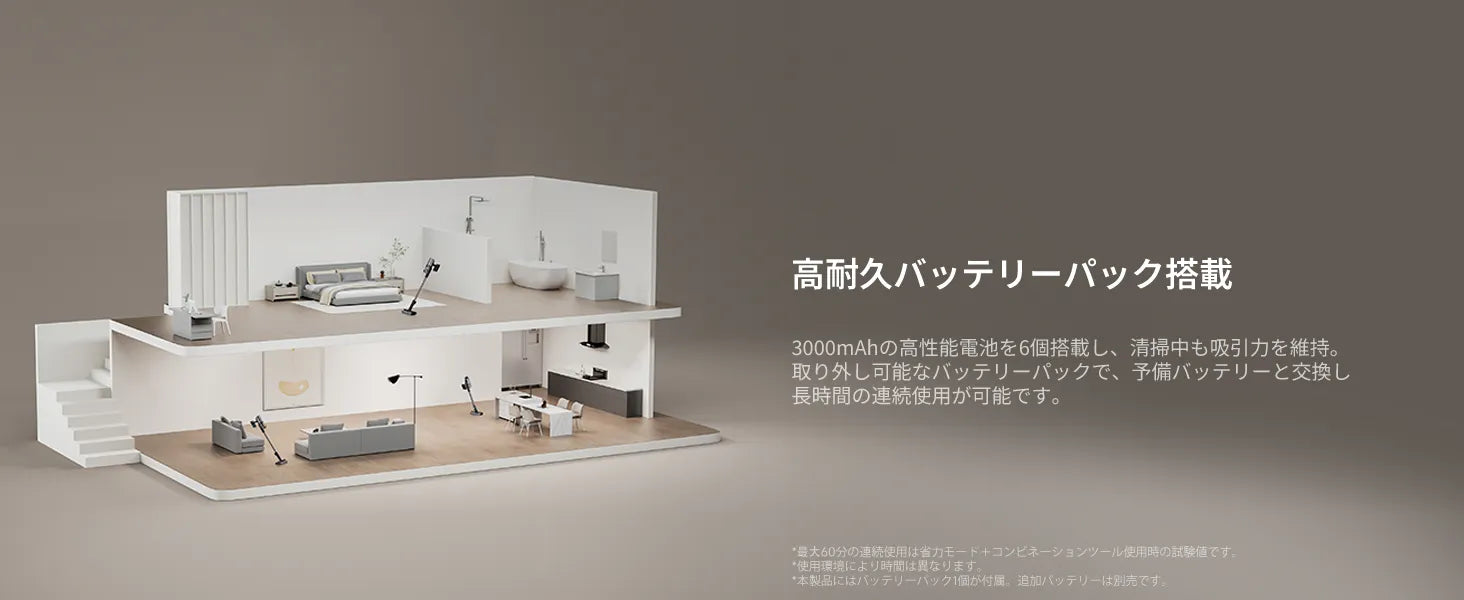 さらに140°ダストイルミネーションが暗い隅のホコリまで照らし出します。最大60分の連続稼働で、家中を一度でキレイに。