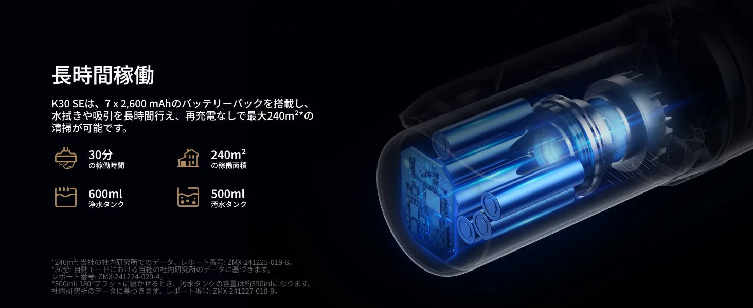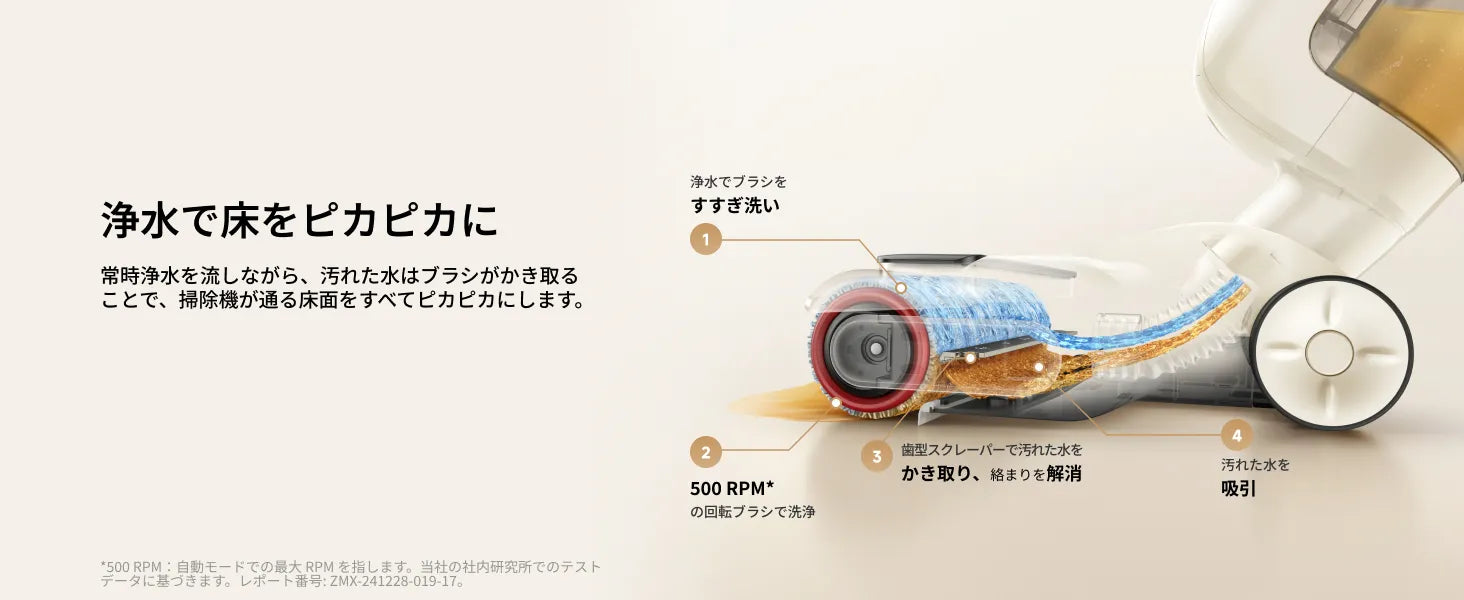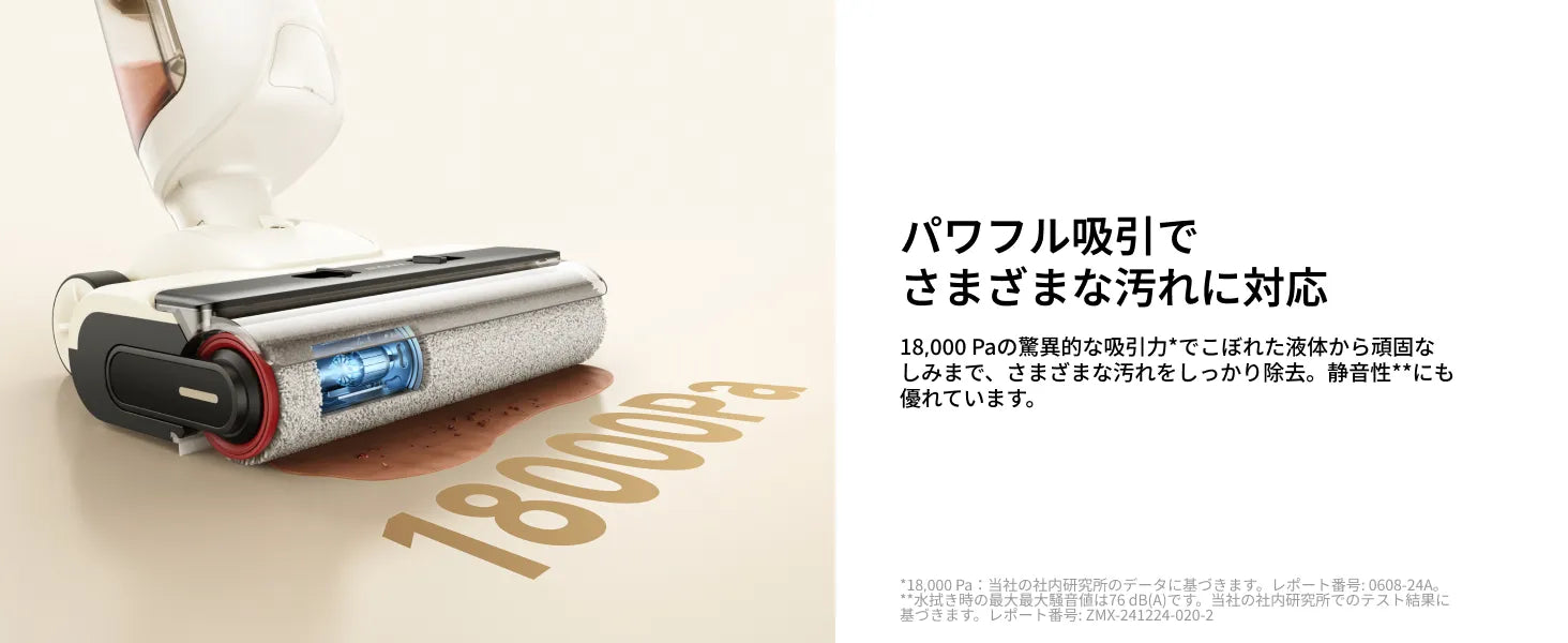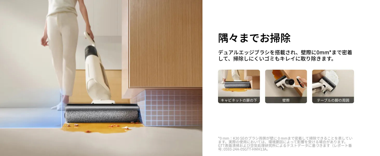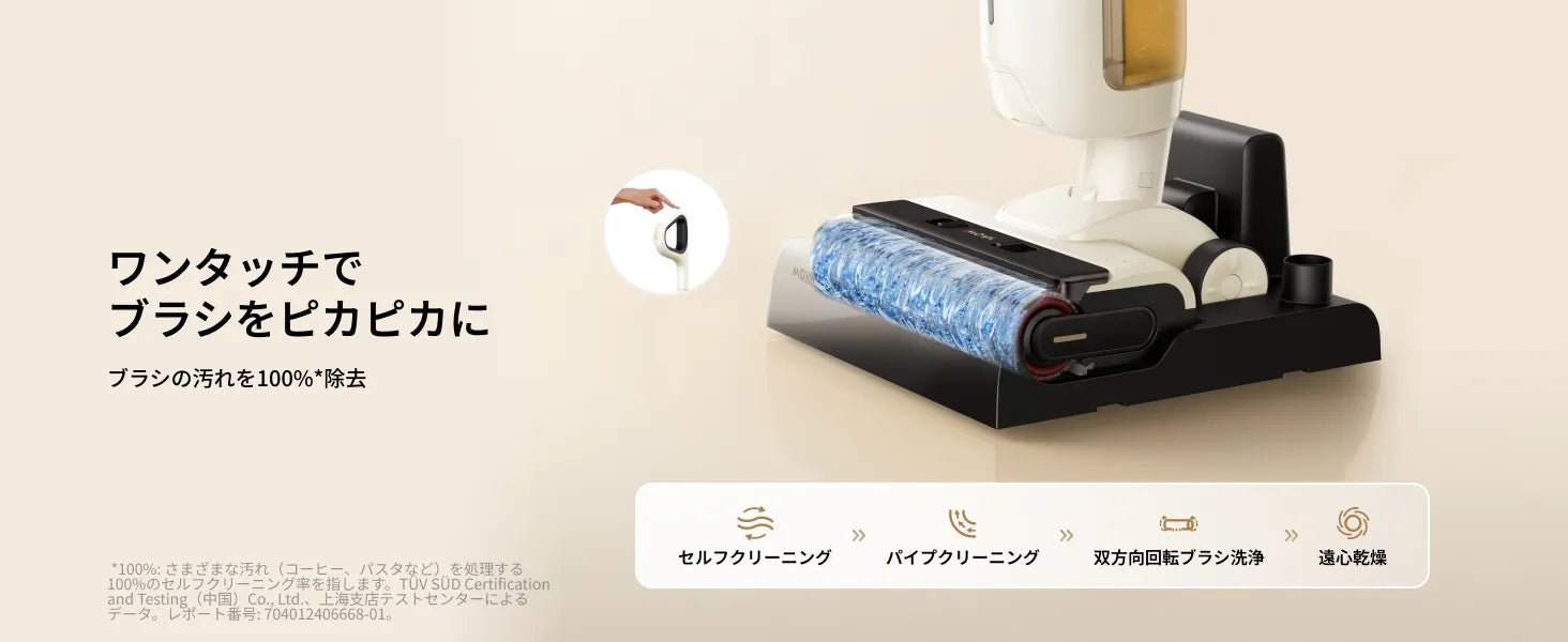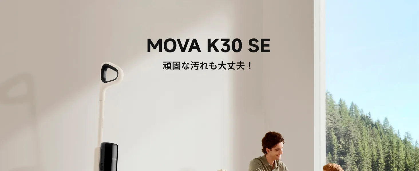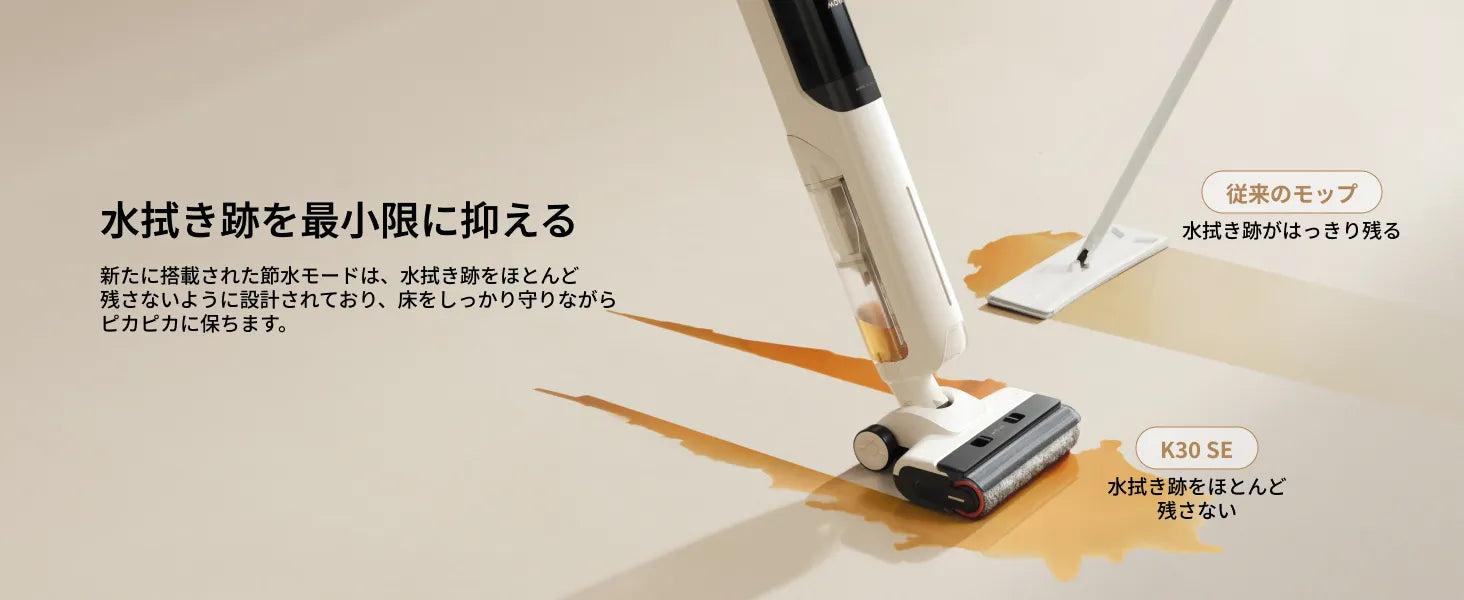 MOVA K30 SEは、18,000Paの強力吸引と500RPMの高速ローラーブラシ回転を両立したハイブリッド水拭き掃除機。