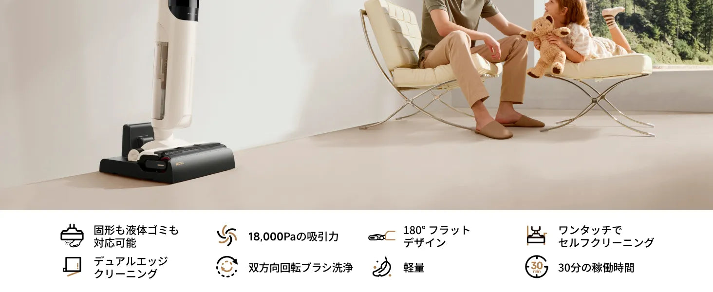 液体・固体どちらの汚れも1台で吸い取り、180°フラットリーチ構造で家具下もスムーズに清掃します。