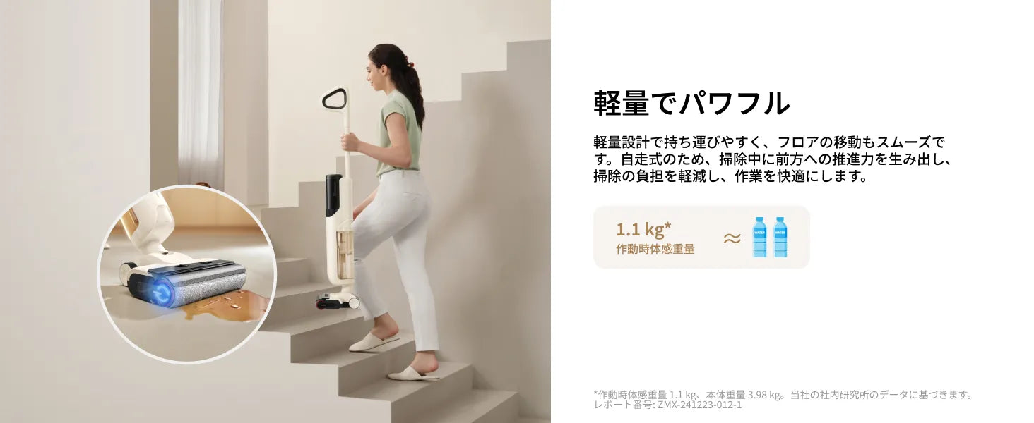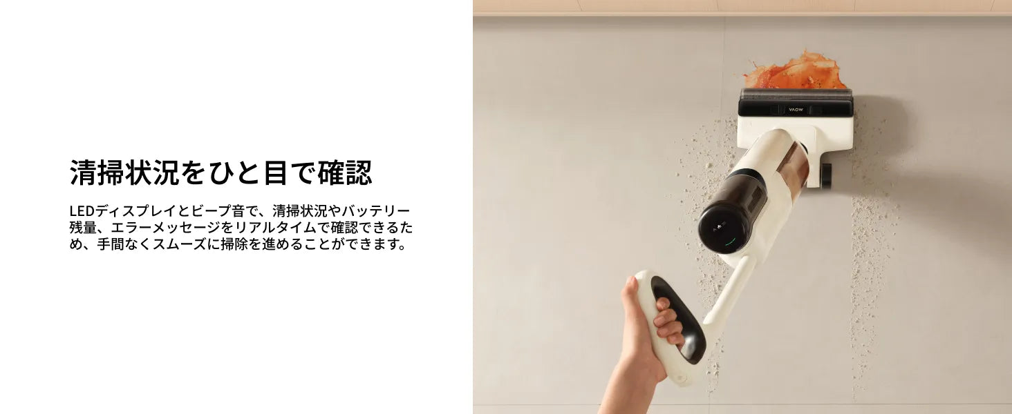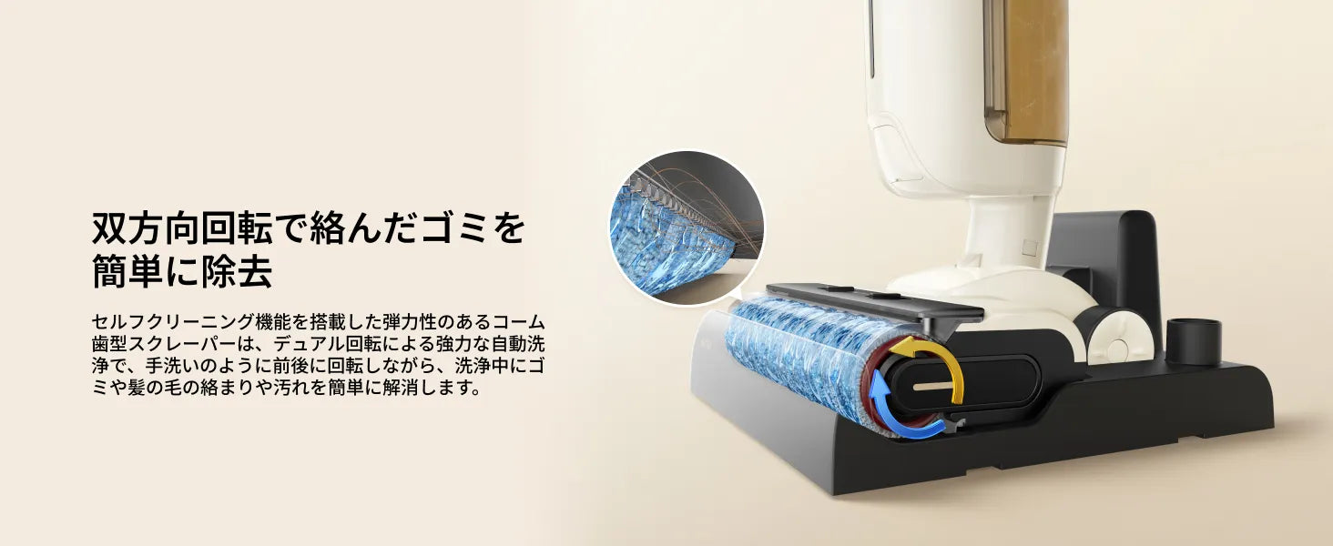さらに、デュアル回転ブラシ洗浄とコームスクレーパーで髪の毛絡まりを防止。自動セルフクリーニングとLEDディスプレイを搭載し、清潔で直感的な掃除体験を提供します。