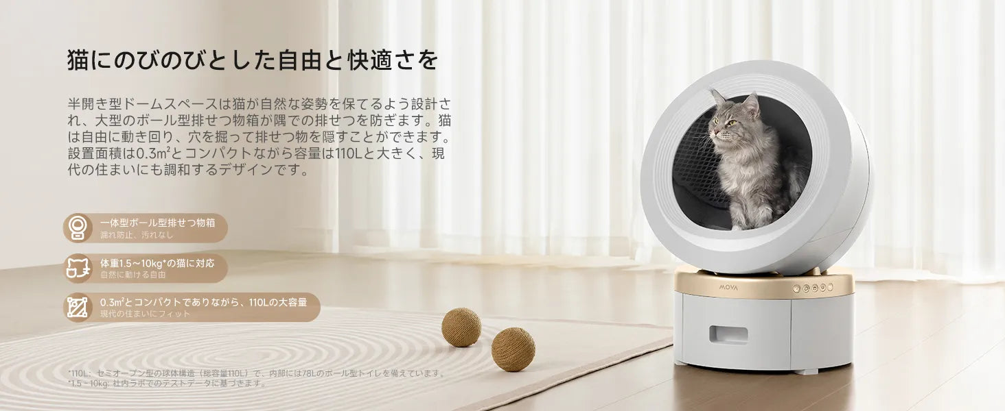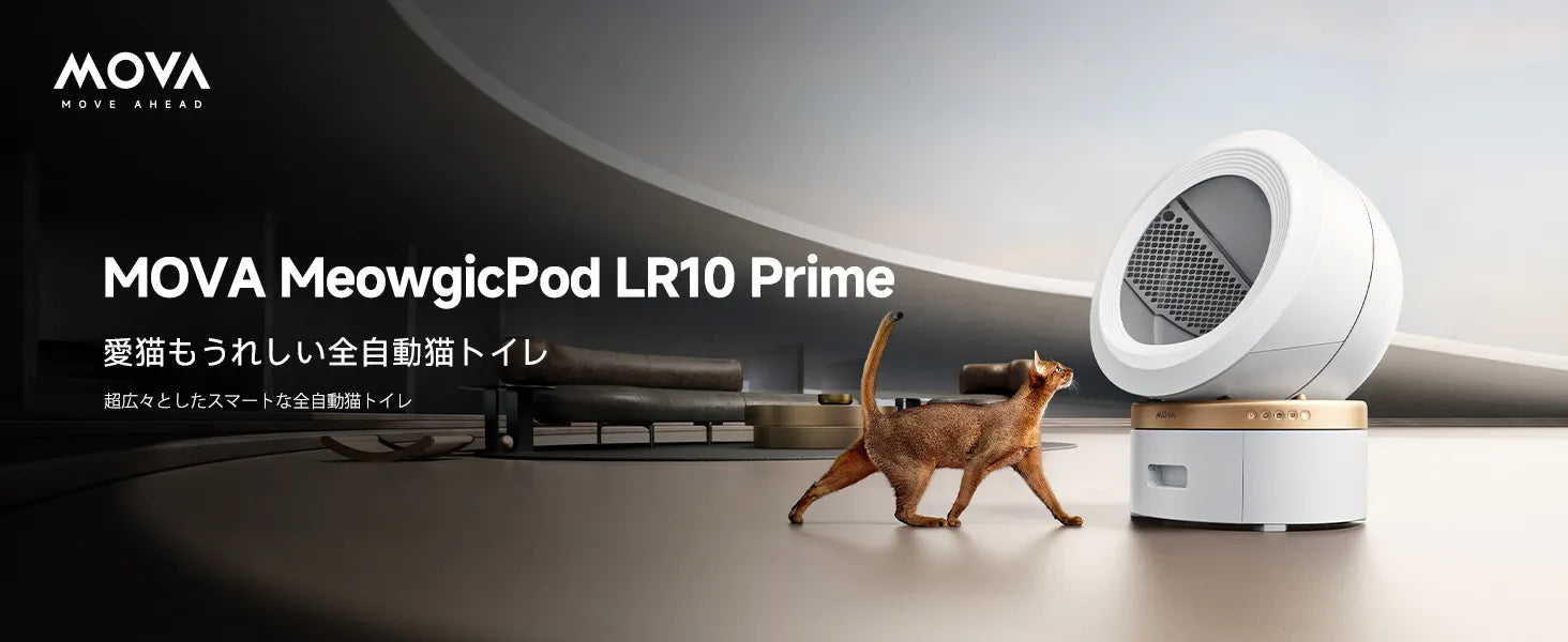 MOVA LR10 Primeは、猫と飼い主の快適さを両立した最新型スマート猫トイレ。110Lの大容量セミオープン構造で、猫が自然な姿勢で使用できるゆとりの空間を確保。