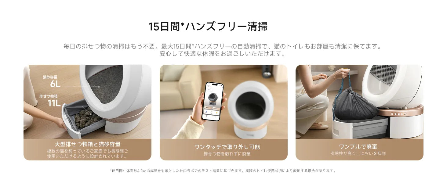15日間のゴミ捨てなしにより、毎日の手動掃除が不要です。