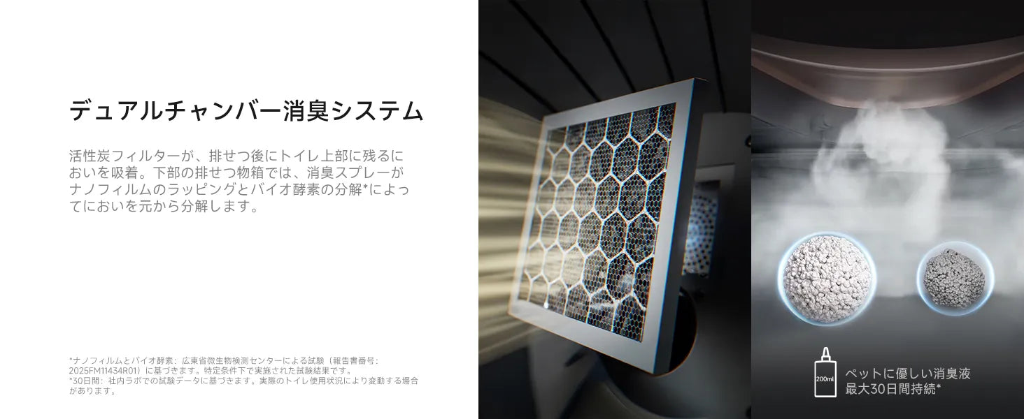 上部の活性炭フィルター+下部の自動消臭スプレーによるデュアル消臭システムが、臭いを根本から除去。