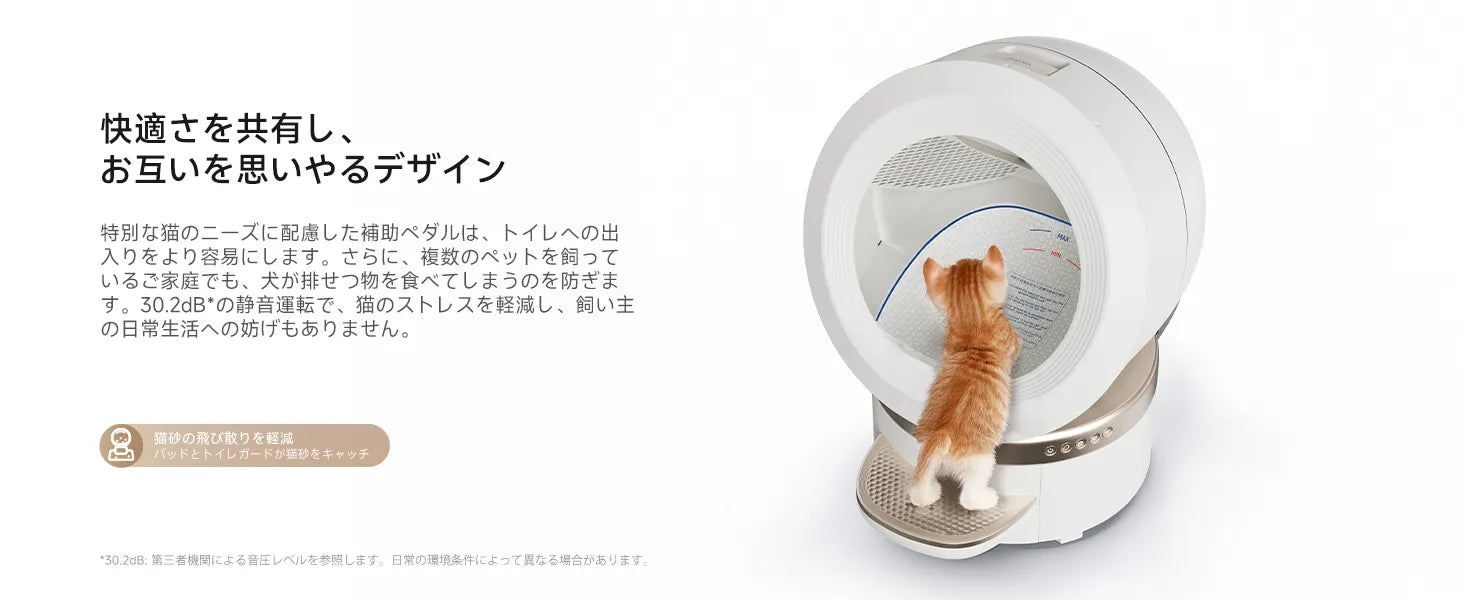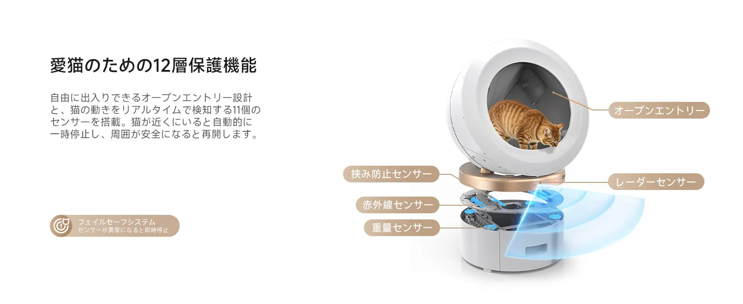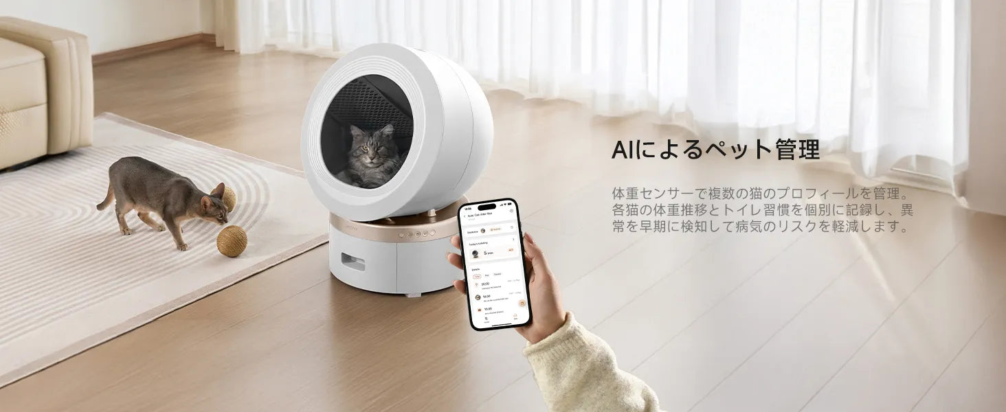 さらに12層の安全センサーとAIペット管理機能を搭載し、複数猫の体重・排泄習慣を自動で記録。