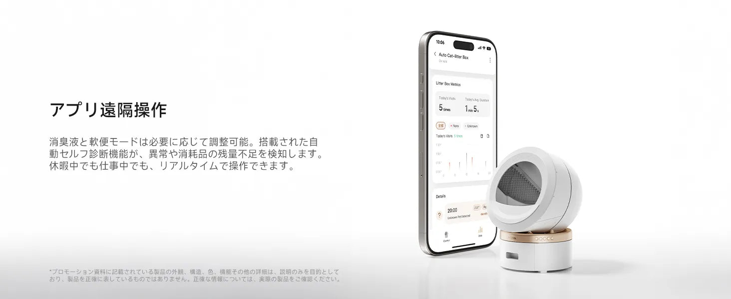 スマホアプリと連携し、外出中でもリアルタイムで操作や健康チェックが可能です。