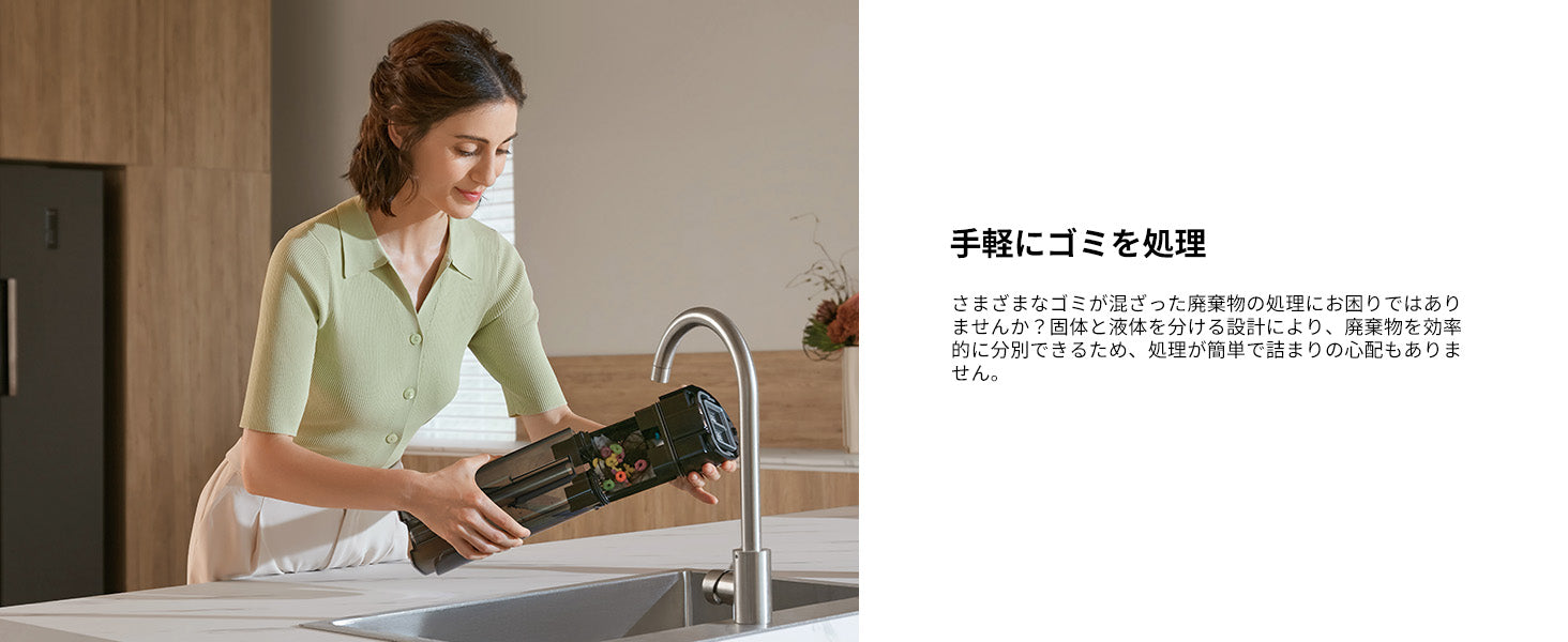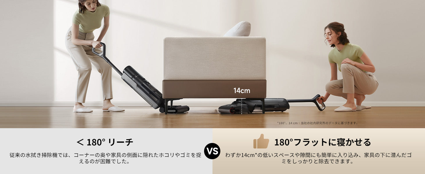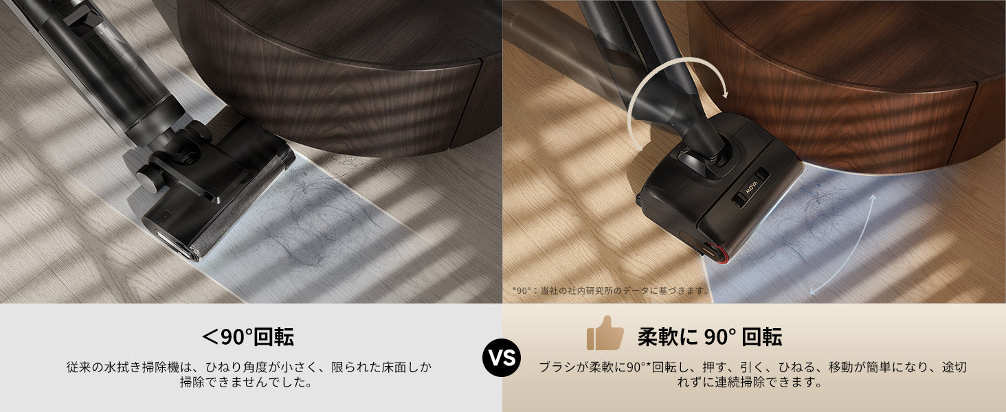 180°フラットデザインで家具の下や狭い隙間にもスムーズに入り込み、隅々まできれいにします。ブラシは90°回転可能、18,000Paの驚きな吸収力、自走式設計で作動時の重量はわずか0.9kgということで、引く、ひねるなどの動作がカンタンにでき、効率的に掃除ができます。