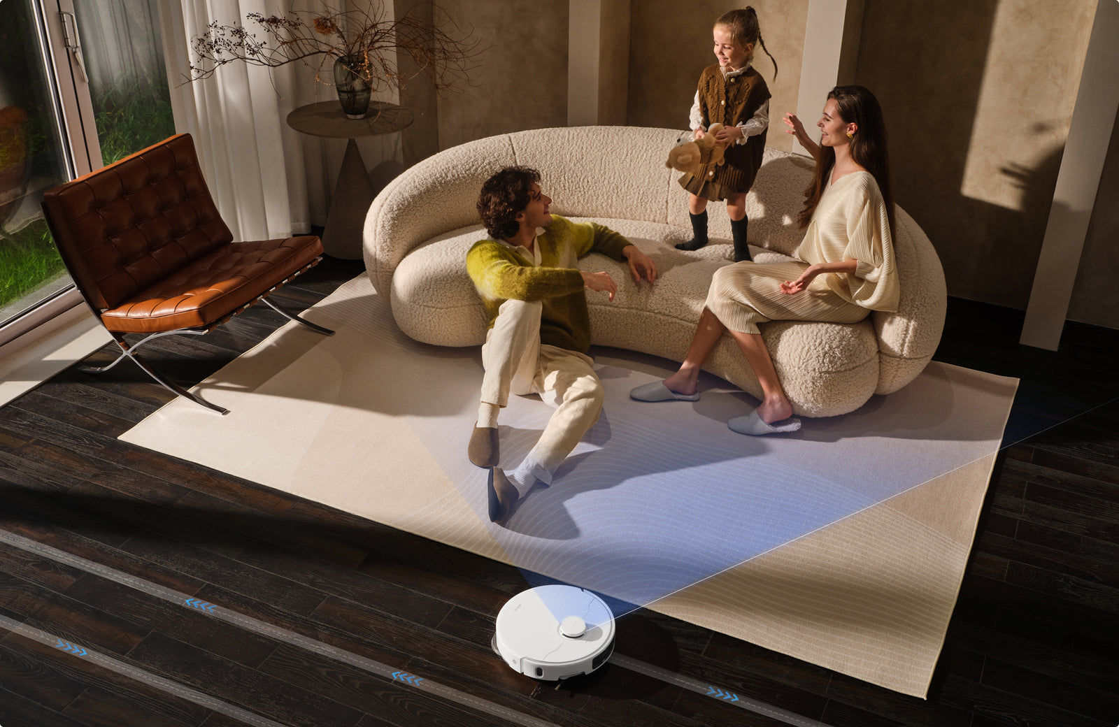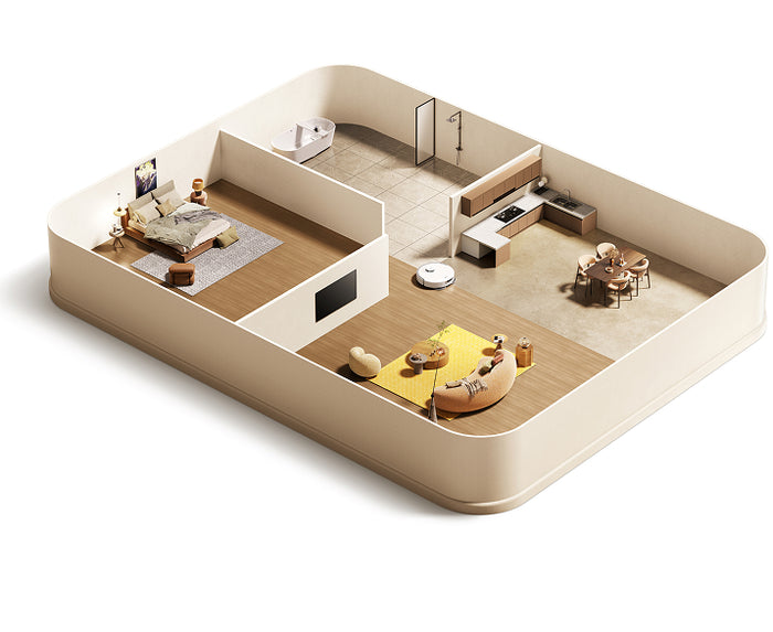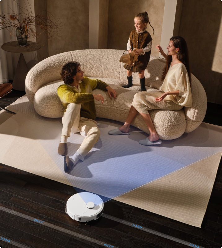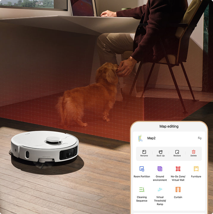 クリーニングアプリの設定をカスタマイズして、ご自宅にあった設定に変更できます。立ち入り禁止ゾーンやカーテン掃除エリア、家具の位置を設定することで、シームレスな制御とすっきりとした空間を実現できます。