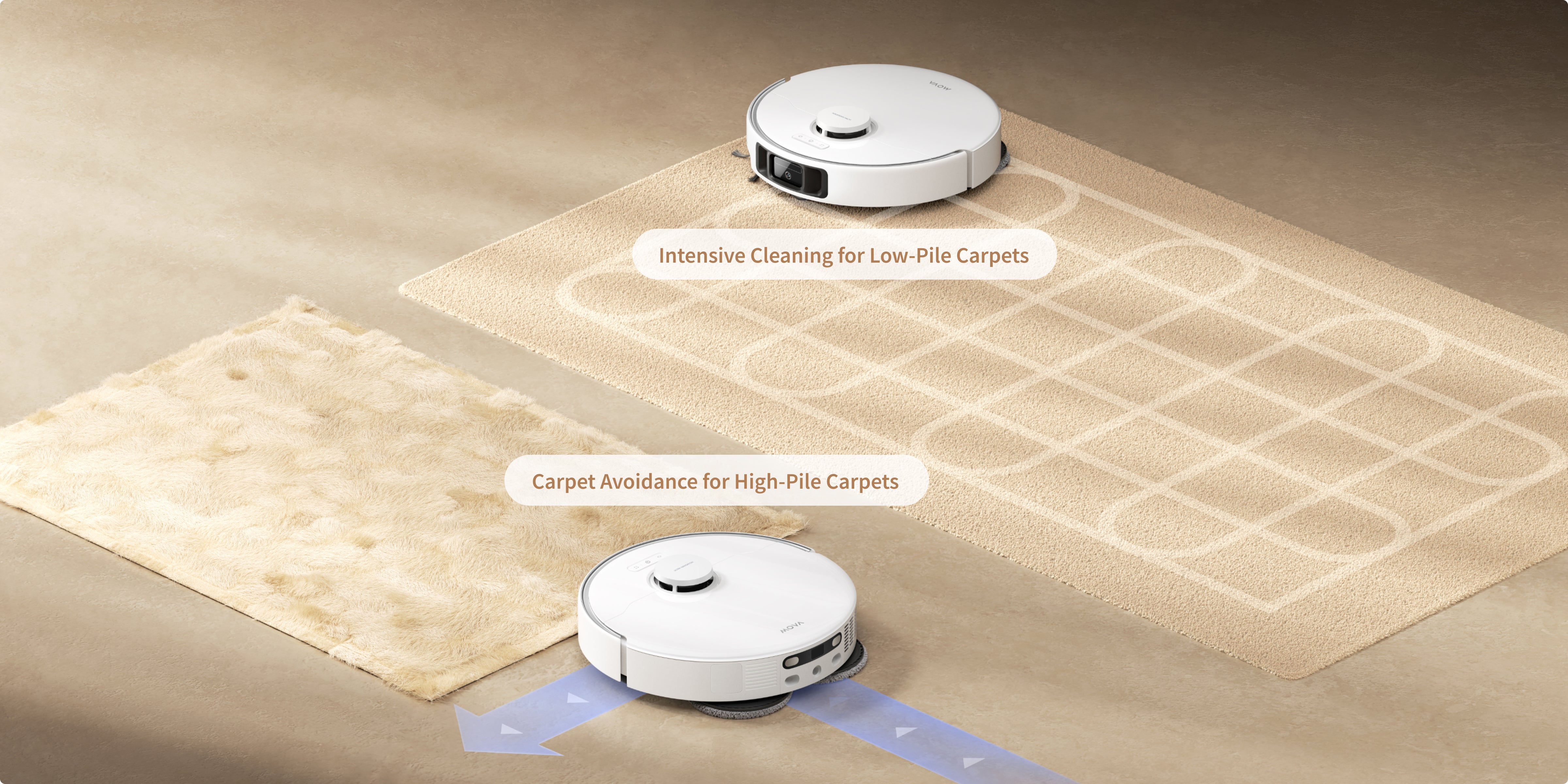 *毛足の長さが3mm(0.12インチ)を超えるカーペットについては、クリーニングアプリを使用して、ロボット掃除機が中・長毛カーペットを避けるように設定して、カーペットが濡れないようにすることをお勧めします。